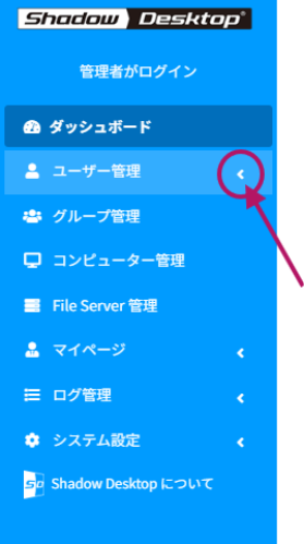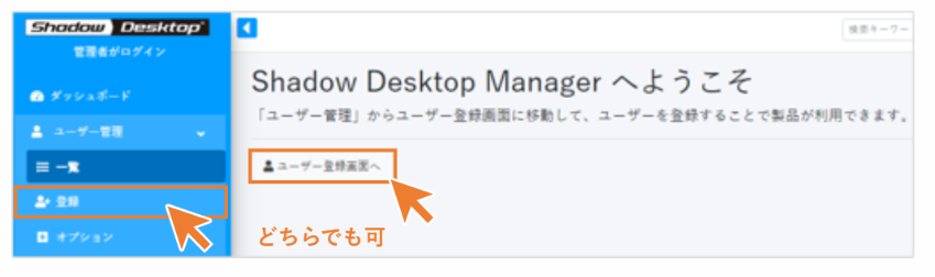 ①「ユーザー登録画面へ」をクリック、もしくは左のメニュー画面の「ユーザー管理」の右側の矢印を押し、「登録」をクリックしてください。
