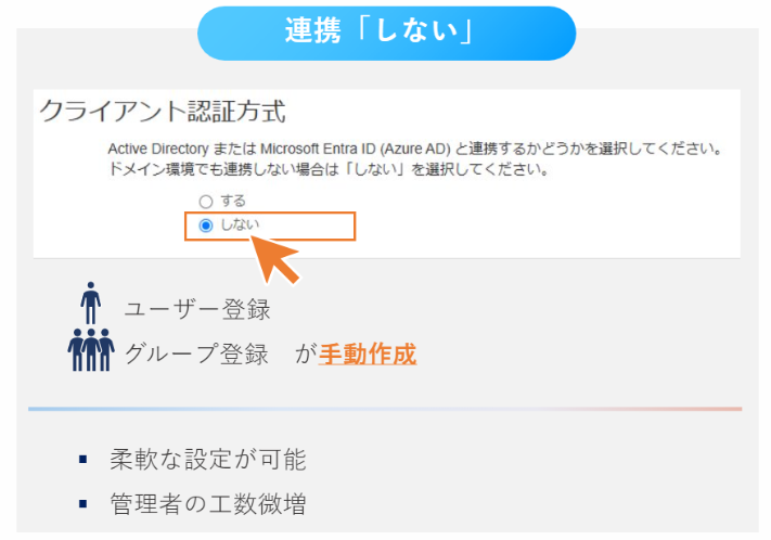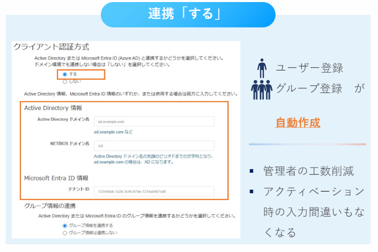 Active DirectoryまたはMicrosoft Entra IDと連携することで、ユーザー登録及びグループ登録を「自動」で行います。