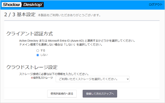 「(6)」の手順の際に「クライアント認証方式」で連携「する」を選択された方は「(8)Shadow Desktopをインストールする」にお進みください。