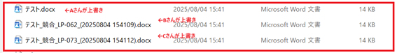 (画像のように、「テスト.docx」がAさんの内容で保存され、Bさん・Cさんの内容は競合ファイルとして別途作成されています)