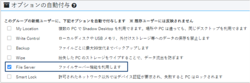 ※一般ユーザーが「File Server」オプションを有効にするには、事前にシステム管理者が Shadow Desktop Managerから利用開始設定をする必要があります。設定方法は、Shadow Desktop Managerからご確認いただける「 File Serverオプションマニュアル」にてご確認ください。
