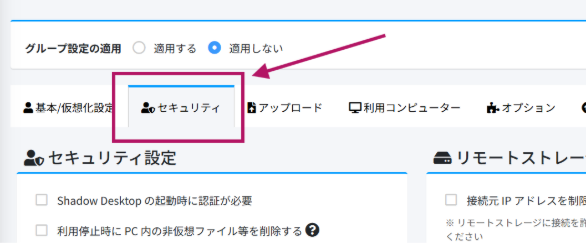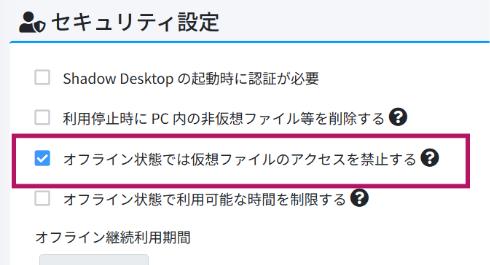 (4)「セキュリティ設定」の中の「オフライン状態では仮想ファイルのアクセスを禁止する」にチェックを入れます。
