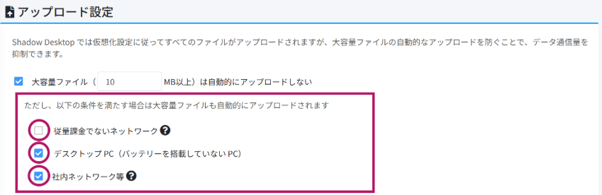 社外やモバイル環境ではアップロードを抑止し、必要に応じて社内ネットワークに接続した際にのみアップロードを行えます。