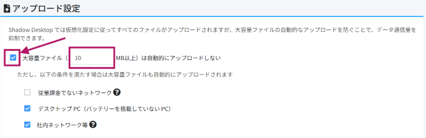 (5)アップロード設定内、「大容量ファイルは自動的にアップロードしない」にチェックを入れます。