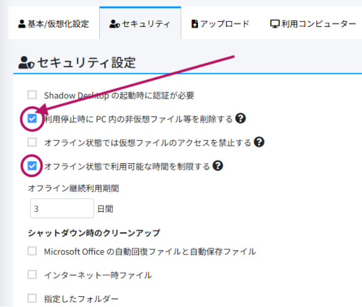 この設定で対象端末のデスクトップ、ドキュメント、ピクチャ、ダウンロード内の仮想化されていない全てのファイルと、Microsoft office系アプリで作成される一時ファイル、Write Controlオプションの許可するディレクトリ内のファイルが利用停止時に削除されます。