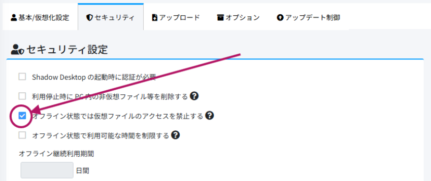 (4)「オフライン状態では仮想ファイルのアクセスを禁止する」にチェックを入れます。