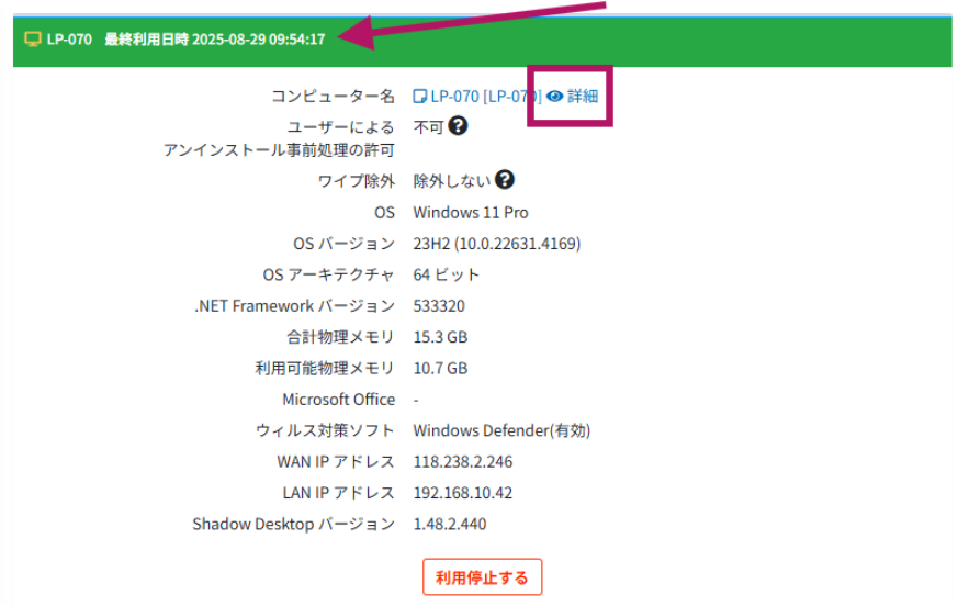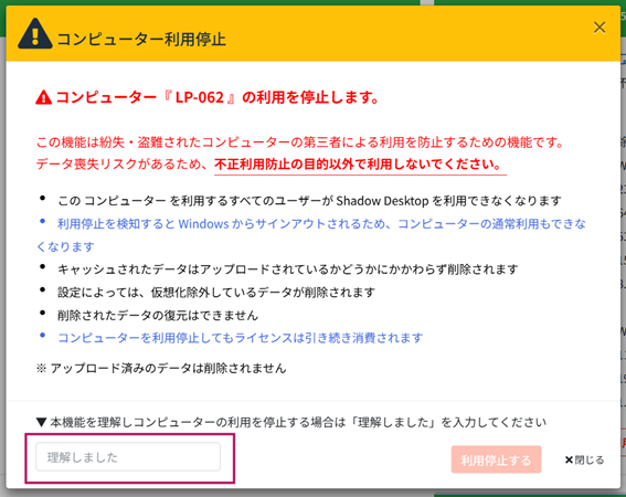 ※この右端の「利用停止」を押すとユーザーが登録している全てのShadow Desktop端末が利用停止されてしまうためご注意ください。