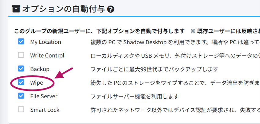 (3)「オプション」をクリックし、「オプションの自動付与」で「Wipe」にチェックを入れます。