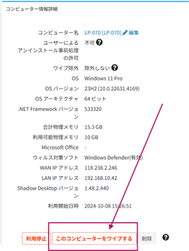 ※ワイプする端末が「利用停止中」の場合、上部の利用コンピューターをクリックし、利用コンピューター一覧の「利用停止中のコンピューターは表示しない」のチェックを外してください。