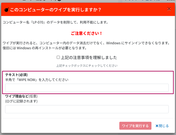 (3)テキスト欄に「WIPE NOW」と書き込むとワイプが可能になります。