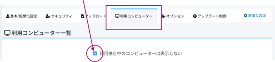 ②上部の利用コンピューターをクリックし、利用コンピューター一覧の「利用停止中のコンピューターは表示しない」のチェックを外してください。