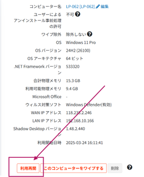 Shadow Desktop Manager(管理コンソール)から「利用再開」を行います。